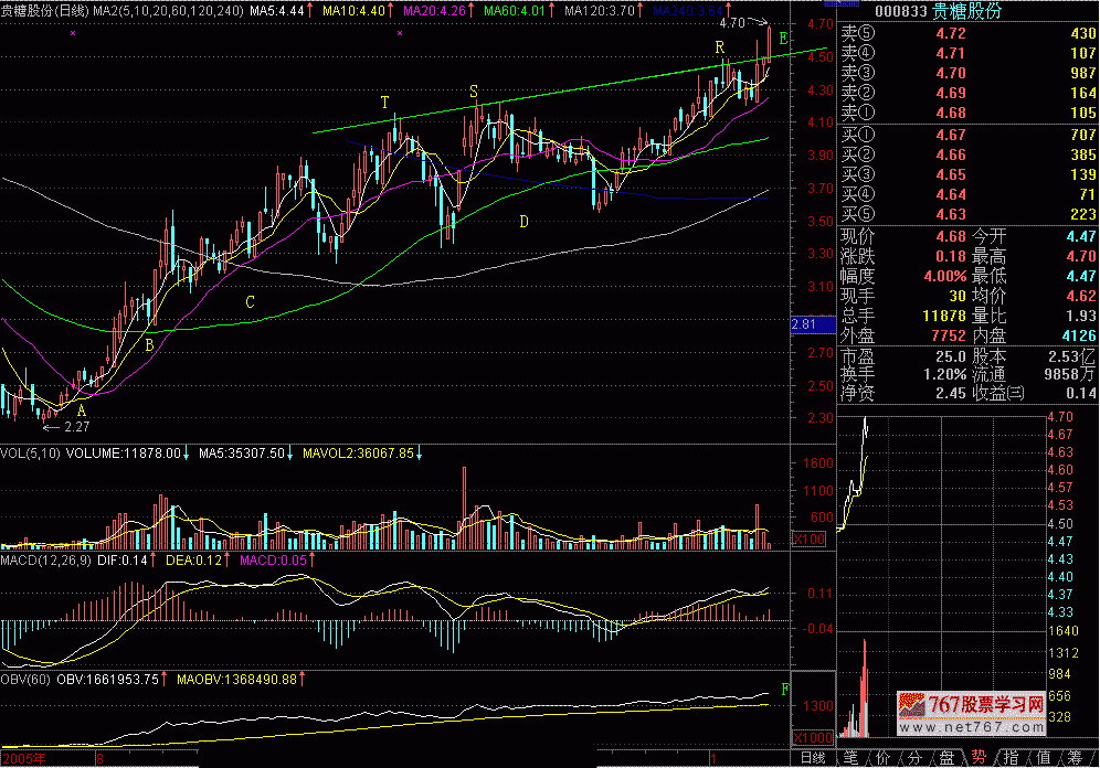 把各股价高点R、S、T用直线连接成颈线,目前贵糖股份日K线正在冲过颈线,见图中E处,现在买入收益大、风险小。
