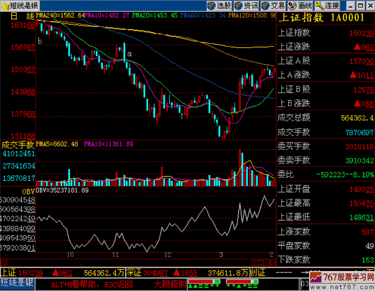 指数目前是什么处境呢?在它的上方有120日线和240日线的压力,多方若用目前这种走势、目前这种能量向上攻击120线和240线(或者说半年线和年线),显然力量是不足的。况且,就是现在打上去,也不知道空方在这儿的设防有多么牢固,会遇到什么样的压力也不是很清楚。从历史成交量来看,图中a点处有一定的压力,可是这个地方的压力,也不足以使它裹足不前,真正的压力恐怕还是图中b点之上,现在的240日平均线是1562点,指数即使现在打上去,也是要掉下来的,倒不如不打好。