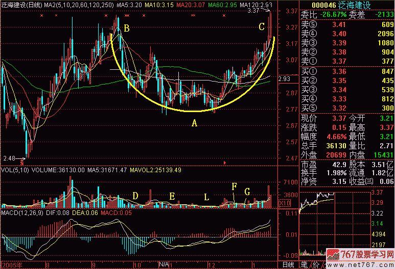 1.图中A点是锅底,B、C是锅边,从B下跌到A,大致经过三波杀跌。每次杀跌到成交量相当萎缩,见图中的D、E和L处。然后拉高股价,制造反弹。庄家杀跌,是看有没有恐慌盘跟着杀出。如果有恐慌盘,特别是大户的大笔杀跌盘跟出,说明盘中还有敌方“潜伏部队”,随后将是更加凶猛的杀跌,就像人们拍打麻袋中的盐巴一样,拍几下,见掉出来的盐挺多,紧跟着就更重地拍打。D点的成交量很小,说明浮动筹码基本杀出,E点的成交量更小,说明暗藏的浮动筹码进一步肃清。这时庄家并不会罢手,庄家习惯性地会再重甩一下,最坚定的持股者终于卖出。L处的成交量最小,小到像芝麻点那样。L点处的微小成交量会持续几天,几分钟才出现1手或几手成交量了,等到实在没什么杀跌盘了,庄家的洗盘任务完成了。