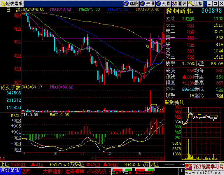 鞍钢新轧今天往上攻,但是它没有跳空,量也偏小,如果早上开盘半小时就有这么大的量,那就叫巨量了。现在都快走一天了,还是这么一点量,这就嫌太少了。它既不符合巨量,又不符合跳空,那么回档不买进。如果明天它巨量跳空,回档就应该买进了。这只股票的线路已经开始逐步地走好了,至少已经慢慢地通过了T线。遗憾的是,量少了一点,我们完全可以在开盘10分钟内,找到【巨量跳空,回档买进】的个股,而不愿意在这个股票里窝一天,一天才1%涨幅,对我们来说太少了,1%涨幅就属于失败,今天短线就算没做好。我们的学员现在每天要么抓到涨停板,差一点也涨7%,涨5%以下就算较差了。每天那么多好股票,抓个5%涨幅,简直就是毛毛雨,大家感觉不过瘾的。像这只股票,如果今天早晨大家跟着冲就错了,量不够,也没跳空。