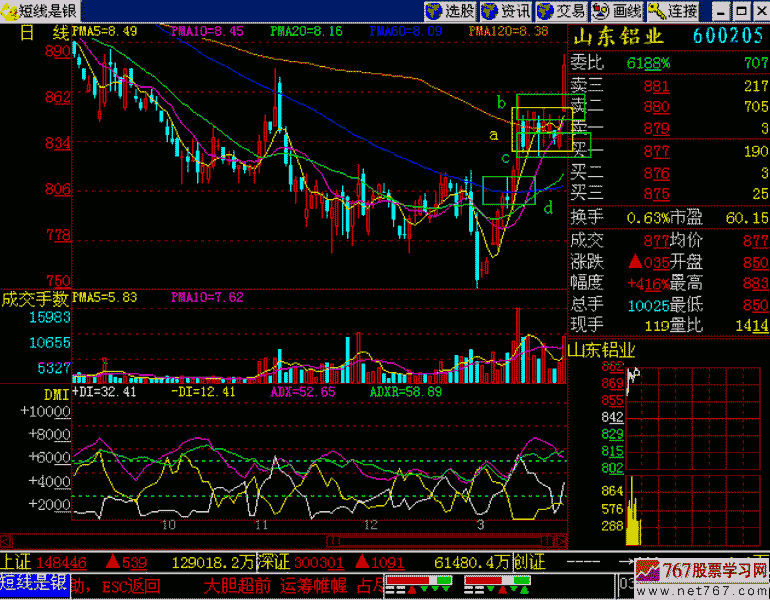 除了120线附近【拉大锯】,60线附近有没有【拉大锯】?也有的。这种个股就更多了,山东铝业在d点附近就发生了【60线拉大锯】。一个股票上扬行情开始后,总要先走到2&3区间,再走到2+3区间,它总要这么走的,绕也绕不过去,飞也飞不过去,打地洞钻也没用,必然先要探到60线,盘住以后再往上攻击,然后再缠绕在120线附近。