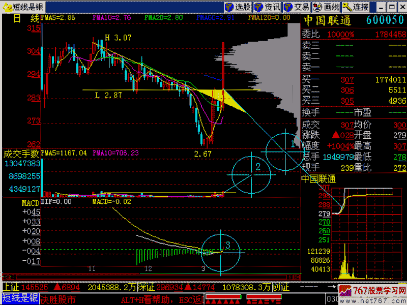 我们从股价的回档开始一直跟踪分析到现在,说什么呢?说这个金三角一定能冲过去,现在股价正在上冲金三角,为什么不追呀!所以基本功学好了,追涨就有信心,就在股价上冲金三角的时候千军万马冲了过去,怎么冲的?我们要掌握好几点:第一个,图中我们画了三个瞄准镜,第一个瞄准镜瞄在什么地方呀?就是2.87元这个地方,也就是说只要股价能通过2.87元,我就打!千年追一回呀!这么明确的事情,此时不追更待何时!在分时走势图上我们就瞄在2.87元这个位置上,所有的火力都集中在这个地方,怪不得这个地方的成交量那么大,是不是我们的同学们都在这个地方使劲,千军万马杀了进去,股价就一路上扬。第二个瞄准镜瞄在什么地方呢?就是当成交量冲过前面这个5日平均量的最高点的一瞬间,就开始动手。第三个瞄准镜是瞄准MACD的后金叉,就在DIF上穿0.00的一瞬间,千万发子弹就出去了。在我们广通技术里边这三个瞄准镜被称做什么呢?第一个是T线瞄准镜、第二个是成交量过前头瞄准镜、第三个是DIF零位瞄准镜。这三个瞄准镜如果同时发生作用的话,此时此刻就是开火的时候,也是我们千年追一回的千载难逢的机会。