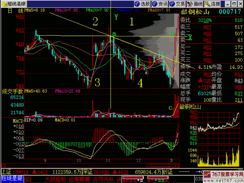 为什么呢?我们来看它的图形:第一点,就是c处一片巨大的阳量和b处的几根连续大阳线,构成了广通技术中的经典图形【东方红大阳升】。这样的股票怎么会不好,怎么会不涨呢?第二点,就是在指数创新低、再创新低的时候,它的底部能够抬高,这也是很不错的。第三点,就是它放量突破了前期【高点连线】,而且第二天紧跟着又是巨量跳空,冲击前高点(见图中a点)。因为此处面临两个前期高点的压力,所以主力在这里采取了一种“冲——回——冲”的方法,从而在第三天一举突破前期高点,这之后就是一马平川,股价一路高歌猛进,今天又是轻轻松松地就涨了上去,并且今天量比在放大,这就形成了一个【量递增,股价不断创新高,顶紧右上角】的良好局面。