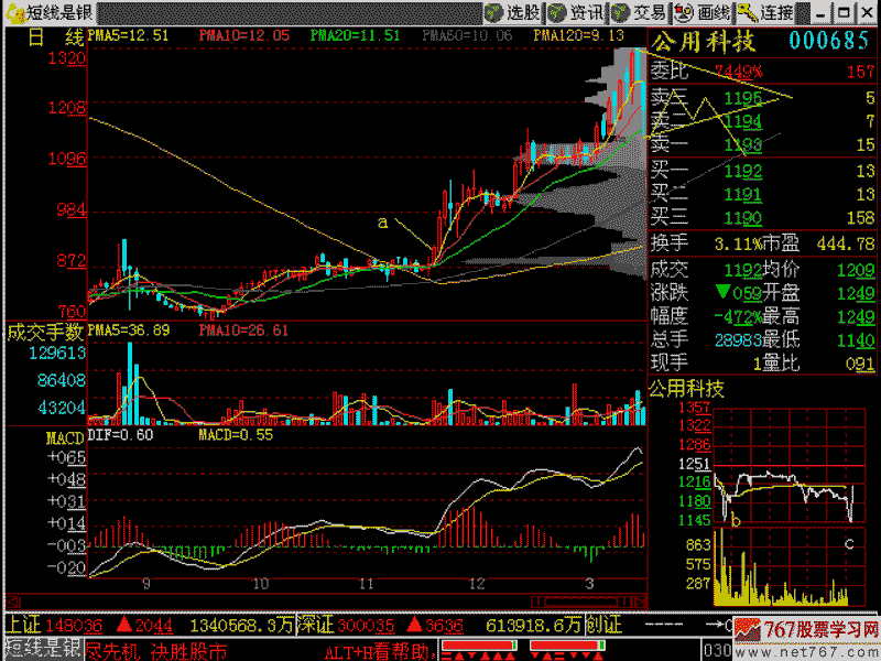 刚刚收到一个Email,是一个外地学员发过来的,他说在8.8元(图中a点)买进了公用科技,见(图202-1)所示。在当时买进还是不错的,因为【放量过前头】,这是对的,没做错。他一直捂到现在,可是本周不换股票就做错了。他这么讲,他以为昨天会涨上去的,没想到今天一个低开,怎么办?这个问题很简单,在本周指数涨得很好,指数大涨情况下,这个股票却连跌两根阴线,这就是【涨势见狗熊】!