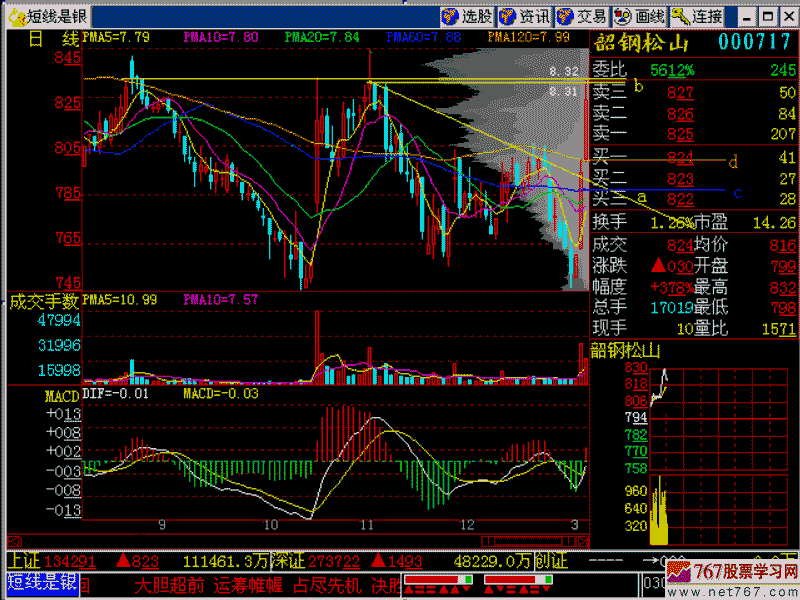 现在来看韶钢松山的分时图,巨量跳空,回档买进。现在还会不会有回档呢?还会有一点点的,昨天我们设了一道道防线来拴住这匹黑马,结果当天就给它打通两条。哪两条呢?一条是60日平均线7.88元,第二条是高点连线(下降趋势线),都是一举冲过,所以说在上升过程中,这个线那个线,统统都是棉纱线。有人说:“哎哟,这儿有个压力,那儿有个压力!”其实真涨的时候,没有压力的。下跌的时候道理也一样,有人说跌到这儿是个支撑线,跌到那儿是个支撑线,真正下跌了,不管你什么支撑线,统统都是棉纱线,没用的。