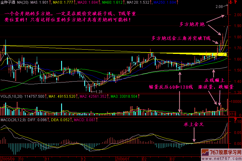 【多方炮后面开炮】往往有两种情况:一种是早晨开盘后还不觉得怎样,突然之间就拉起来;还有一种是直接跳空高开,那就是【巨量跳空,回档买进】!这个图形还有一个特殊性,就是一个长期的三角形盘整带被【多方炮】突破,这个时候它推出去的力量相当大,这是一种喷发性的力量,因为那么长时间以来股价一直受到这个三角形制约,憋得很厉害,憋得它最后没有路好走了,要么往上突破,要么往下突破。可是我们知道,《十九强》跟踪一汽轿车已经有两年多了,我们一直说它是庄股,大家说是不是?我们公开在中央电视台讲过,在《十九强技术》讲座里讲过,在网站上也讲过,就是讲一汽轿车是庄股。为什么?因为它在《十九强》里面表现得非常强烈,经常处于《十九强》第一名。既然它是庄股要做上去,那就决定了它要么不突破,要突破就是往上突破,不可能往下突破。
