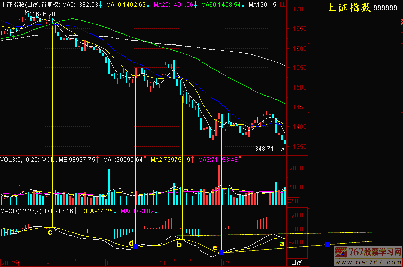 有同学问,一百点一百点地跌下去,什么时候才跌到尽头呢?看图,e点比d点低,只要后点比前点低,肯定不会好。现在DIF高点比前面高点稍微高一点点,DIF和股价走势出现背离,有走好的苗头。这一波跌下去以后,死叉后面必有黄金交叉,如果金叉位置高于e点,我们就有办法了。因为低点在抬高,高点也在抬高,跌势得到缓和,可能构筑底部,有望再起行情。