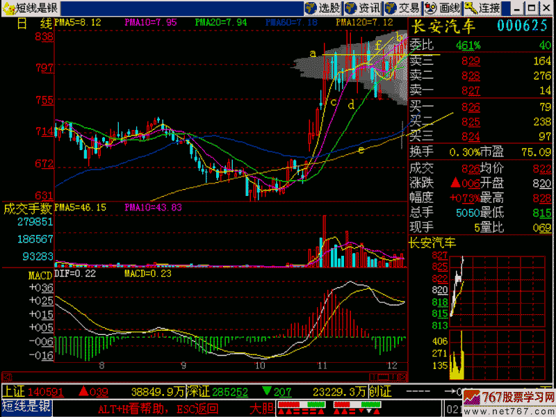 如果5日、10日均线畅通(如c所示)以及10日、20日均线畅通(如d所示),那将是一种什么情况呢?比如5日均线向上走(如f走势),10日线也被及时拉起来(如b线走势),这样就保持了5日、10日均线畅通,股价就在f点突破,10日、20日均线也就能保持畅通,那么60日、120日均线通道也会越走越宽,从而保持【通道宽敞】,像这类5日、10日均线畅通的个股上升力度会更大。