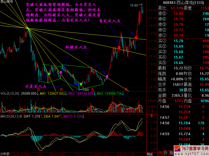 怀疑买入点:如果股价在突破扇骨线时,前面那个底部没有创新低了,但前面的高点还没有创新高,则这个点位为【怀疑买入点】,就是说从趋势上看,股价已经止跌,因为没有创新低嘛,但是股价还没有创新高之前,你是不能确认股价已经进入一轮上升趋势的,所以这个地方仅仅是【怀疑买入点】,对于激进型的投资者,可以适量介入,稳健者不可为;