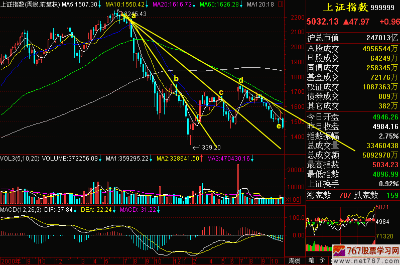 扇骨线第一个特性就是【伺从性】。d点是“624”行情的高点,确立扇骨线以后,股价在扇骨线下已经走了这么长时间了。所以有了这个经验,以后就可以这么说,未来几周或十几周,周K线都会“听扇骨的话跟扇骨走”。
