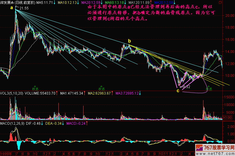 显然b、c、d三个点都是后面的几个高点,从a到这三个点画三条直线,我们发现了一个现象,就是当两点连线确认以后,后面的K线很听话,它们会沿着这条扇骨线走一段路,一旦碰到扇骨线就会回落。在c点也是一样,画好扇骨线以后,K线老老实实的,很听话,真所谓“听扇骨线的话跟扇骨线走”啊。
