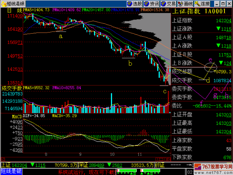 在指数下跌过程中,我的体会是:不要去买最低价,也不要去猜c点是不是最低点,这都是徒劳的,因为低点后面还有更低点,你也不要去追求最低点,这都没有意义。比如说,指数1353点是最低点您抓住了,反弹了三天好像取得了成功,可是你抓错了股票照样不涨,三天可能一无所获,抓一个走势弱的股票可能还要套牢,所以你不要去追求最低点,宁肯等待反弹完毕后不创新低,等d点比c点高一点,也就是说宁肯要d点也不要追求c点,甚至我们d点也不要去追求,而去追求未来过颈线位的e点,e点才算是真正摆脱了下降通道的束缚,刚刚开始进入到上升通道。因为到那时120线可能也下降到e点附近,这样整个下跌趋势也就缓和了。记住一句话:【不要追求最低点,低点后面还有低点】。