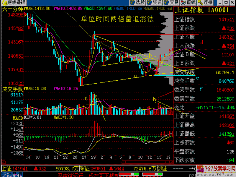 那么,到底要满足什么条件我们才能追涨呢?我刚才已经说过了,要它的量放大,而且量要持续地放大,这两个条件缺一不可;例如像g点处,它虽然放量了,但没有持续,所以就跌下来了,它如果能持续放量,这个行情就可以走得更远。现在h处更糟,一点量也没放,更谈不上持续了。究竟怎么样才算放量呢?我们有个标准,就是【单位时间的两倍量】。现在我们看的是60分钟K现年图,单位时间就是1小时,两倍量就是超过5小时和10小时均量线的两倍。我们来看g点第一根大量,它达到了这个标准,我们可以在半个小时的时候,就发现它的量已经抵达了5小时和10小时均量线,那么剩下来的量就是多出来的量。等到第一个小时量达到了5小时和10小时均量线的两倍,就可以把第一部分资金推进去,然后如果发现第二个小时量还在持续放大,就把第二部分资金推进去,如果以后每个小时的量都在放大,就可以继续推进资金,但是如果量萎缩了,那就不能再追进了。做股票就要这么做,这就叫做【单位时间两倍量追涨法】。