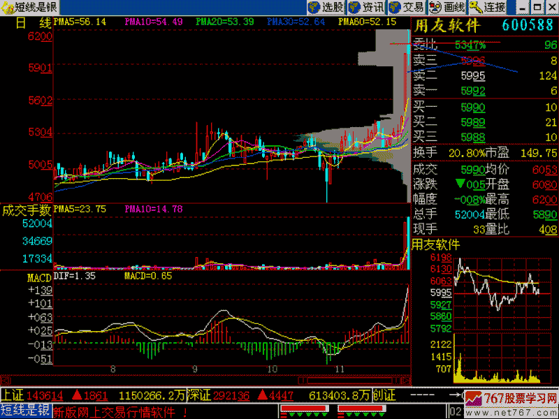 今天上午600588用友软件曾经冲高到62元,从昨天到今天收益应该说是很好的。它今天的量比昨天还要大,然而今天却开出一根阴线。对这种个股,一般的炒作原则是【巨阴不涨先退场】,先把它退出来再说。见(图171-1)所示。