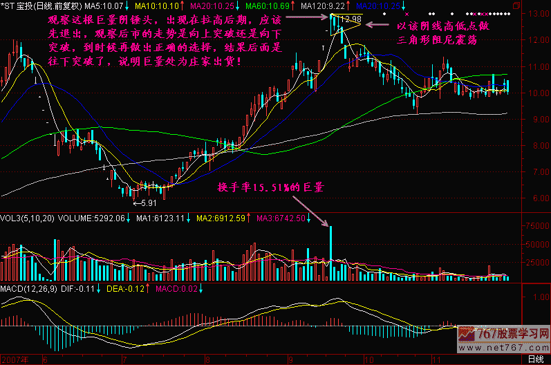 这是为什么呢?因为巨大的成交量容易给庄家出货造成一个机会。因为庄家没有必要再到这儿建仓了,他一定是在下面低位建的仓,下面的建仓筹码拉高到上面来,他有丰厚的利润了,就可以出货,而这时很多散户跟进来就为他创造了出货条件,所以这个地方我们要有一个提防。一般来说,30分钟图中,4根K线不涨就应该出货,现在已经7根K线了,还不涨那就要先退出来。退出来后怎么办?可以做这么一个打算:以后该股可能会在这儿震荡,不管它震不震荡,它如果要涨,一定会创新高,我们就可在颈线位处等着它。但它更可能是在现在这个位置做一个【三角形阻尼震荡】,然后再作打算,要么上去,要么下来。不管怎么说,你呆在这个三角形里面,风险还是比较大的。【巨量不涨先退场】,这是一个经验之谈,你先把资金退出来,就可以进退自如了!