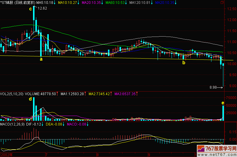 因为股价长期不跌,一直维持在ab线的上面,只是一种暂时的稳定状态。一旦被打破,就有暴跌的可能。图中跌势刚刚开始,昨天的阴线把头从ab线伸出来了,今天一路出货,放出了巨大的阴量(图中e),收盘的时候又收上去了,真是欲罢不能啊。还想抢救,但是又要出货,充分地暴露了庄家的矛盾心态。