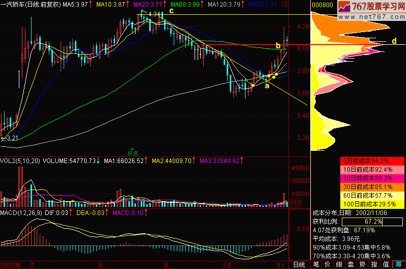 一汽轿车与长安汽车有些相似,首先它的5日、10日均线通气,四根均线挑战一根均线(60线)。另外一汽轿车还有一个特别之处就是【金蜘蛛】。5日、10日、20日、120日四根均线在a处形成了一个结点,形成一只四条腿的蜘蛛,并反翘向上。这种图形是由若干个金叉汇集在一起形成的,是一个金叉密集区(见图中a处)。我们以前讲过【后金叉买进】,而现在它不是【后金叉】,而是四个金叉集中形成在一点,均线在此处形成了共振,均线在这里聚合了。5日、10日、20日、120日平均成本就在这里,只要能涨上去,大部分人都赚钱,跌破它,大部分人都套牢。现在这个【金蜘蛛】要上去,上挑60线(见图中b处)。这个挑战一旦成功,走势就又是一个长安汽车。