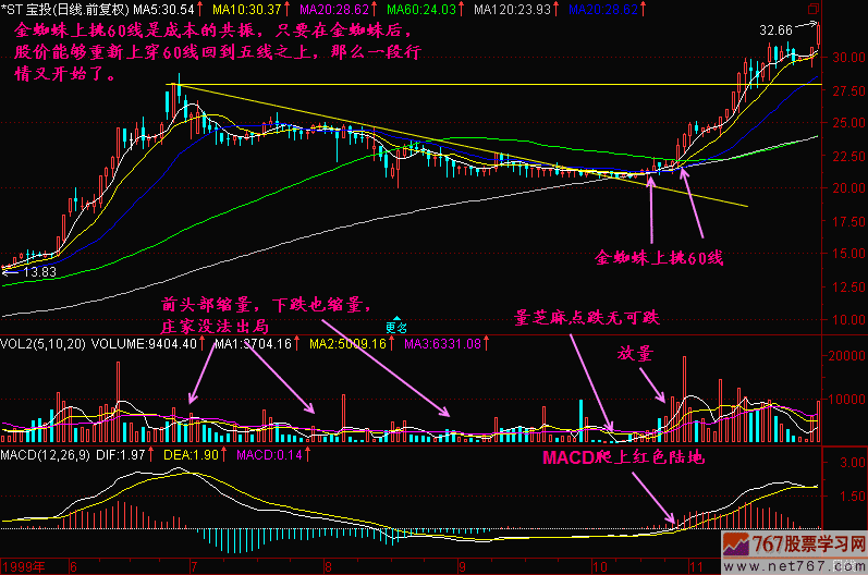 这个大庄股以后会怎么走?我对庄股的操作一般是这样的:首先确定它是大庄股,用十九强技术就能解决问题。十九强我们用了七年,从来没有一只大黑马漏掉,任何一只大黑马都会榜上有名,对这个技术我们是非常有信心的。然后,就是从形态上再对这个庄股进行分析。上次我们讲了一个【后金叉技术】,这次我们要讲一个特殊形态【金蜘蛛上挑60线】。