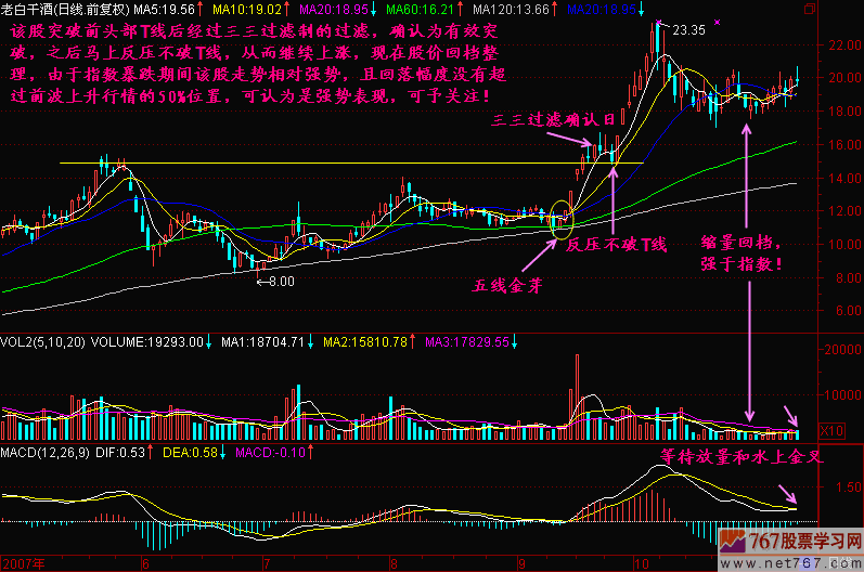 经过【三三过滤】之后的股票,也还会出现反压T线的走势,但首先我们已经确定了它是一个有效的突破了,那么就是说,在趋势上它还是上升趋势,这点我们使用【三三过滤】制已经确定了,但股票走势有强有弱,确定了并不代表就万事大吉了,我们还要得对股票突破T线后的表现强弱进行观察,尽量介入强势的股票,而避免沾手弱势的股票。