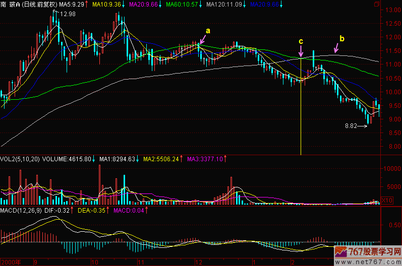 第161节:五均线向下发散见(图161-1)所示。图161-1这个图正中间圆圈里a点有一根阴线,这根阴线小到什么程度?小到肉眼几乎都看不到它,就是这一根阴