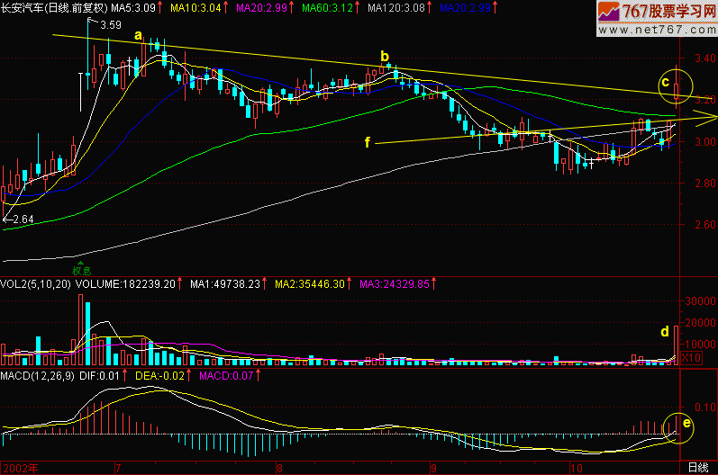 另外,还要尽可能地保持【暖气带】(图中f箭头所指60日、120日均线这个通道)不要闭塞,尽可能保持畅通,只要能挤得过去,这个图形就相当漂亮。【暖气带】只要能保持畅通,这匹黑马就是力大无比。大家记住我(唐老师)的话,这是一条经验,就是从熊市走过来的股票,60日和120日均线这个【暖气带】如果能够给它挤过去而不封闭掉,这个黑马力度就大,封闭了的就要次一点。