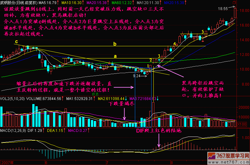 在分时图上,介入点相当于哪一个位置呢?就是刚刚拉起一瞬间。我们很多老师动作都相当快,就在黑马过栏杆的一瞬间马上打进去。此外,给我们信心就是巨量,一定要有巨量。刚才讲的是【黑马跳栏】,这个黑马一定要带量跳栏,这样就显得更加可靠。还有,MACD中DIF指标要转为正值,它现在已经明显走到了零轴上,这个股票已经开始走强了。