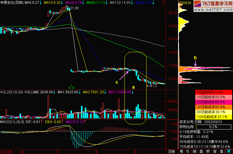 这只股票的走势还有一个特点:就是它除权下来后,在b点位置形成的筹码峰相当丰富。其实,它的上档筹码峰并不大,除权以后筹码峰才比较丰富,实际上b区间筹码峰的真实意义是与上档的筹码峰重叠的,复权以后应该是重叠的,所以b区间筹码峰规模相当大,现在根本不可能向b区间筹码峰进军,根本没有这种可能性,这个筹码峰太强大了。