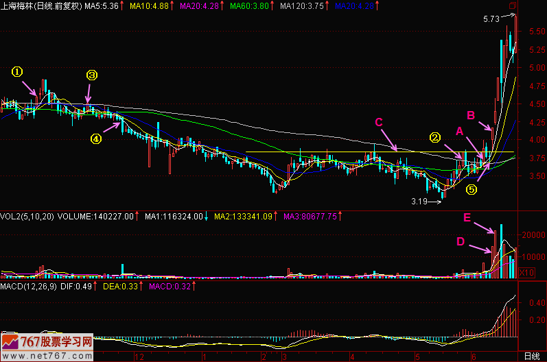 B线所指的阳线冲过了C线所指的颈线位,D线所指的巨量阳线是最近一段时间的顶天立地量,它是10日均线的4倍左右,这就符合了我们买入股票的的几个重要条件:顶天立地量、沉不下去、放量过颈线。所以,B线所指的那天是最佳买入点。E线所指的巨大成交量再创顶天立地量,此时形成东方红,大阳升的图形,这与①附近的图形就有明显的区别了。