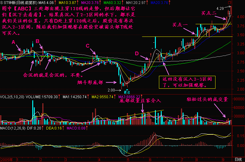 在实际的行情中,很多判断需要实验去证明,我有过这样的经验,如果要踩着一根木头过河,先用一只脚踩踩这根木头会不会沉到水下去,不会沉的话再上一个脚,想来大家都会这样试验。假如我们怀疑①附近是买入信号,我们可以等待股价沉到120日平均线下面,看它能不能再次回到120日平均线上,因为会涨的股票必须上穿120线才会涨,这给我们守株待兔的机会。①处股价沉下去后,原以为在③处会冒出水面,结果在④处发生五线顺下,那么,该沉的东西就让它沉吧!以后再说。用这样简单的方法,就避免了一次风险!