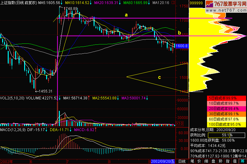 图(136-1)中,昨天指数反弹冲过了10日均线,今天再次下跌,并跌破5日均线,现在指数是1604点,而5日均线是1605点,又处在了【五线之下】。昨天我们讲【反弹就是反弹,弹不动了就走】,就像一个皮球从桌面掉到地上,反弹时不可能再弹到桌面上去,弹不动就走人。今天我们再用一种方法来解释为什么下跌?就是因为上档套牢的人太多了,前面那个“6.24行情”套住了太多的人。