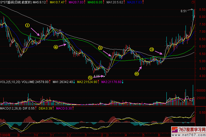 ①所指处股价上穿60日平均线,在这里买进后,股价几乎没有盈利的空间,在2&3区间盘整一个多月后,股价进入又一轮下跌,从6元跌到4元,低价位跌势的损失达30%。②所指处也有一次股价上穿60日平均线的机会,心急的股民以为到了建仓的良机,买入后好景不长,又出现一轮下跌,如果在低位割肉的话其损失也不小。③所指处又出现一次股价上穿60日平均线的机会,这次买入后,股价再也没有回到买入价以下,并且出现了一轮较好的涨势。