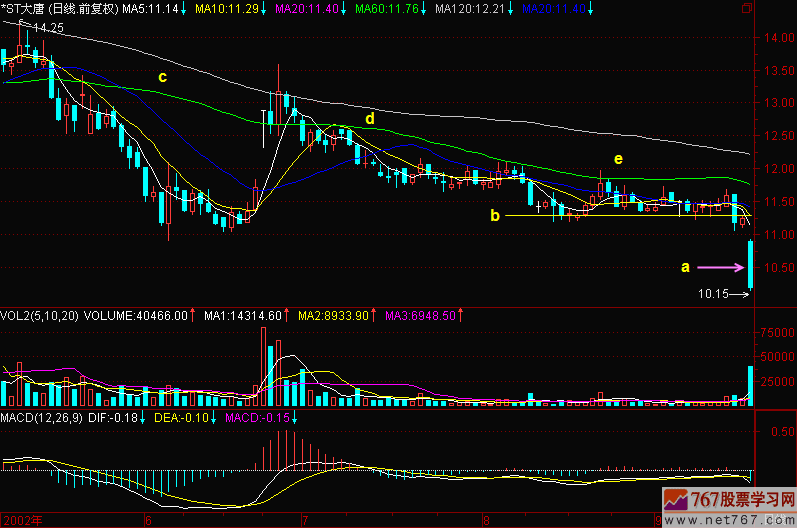 我们广通技术讲究,不在【2-3区间】持股。就是说,在60日平均线和120日平均线组成的带宽下面不持股。【我们不做2-3】,这是广通技术的口号。你要是发现自己的股票在【2-3区间】,就不要,将来股价到了【2+3区间】我们再进去。股票位置再低,只要它在【2-3区间】,它潜在的危机是存在的。我们把60日平均线和120日平均线之间的空间称作【冷空气带】(如图c、d、e所示),这样就形象多了。冷空气沿着【冷空气带】吹下来,一切敢于穿刺冷空气管道的K线最终统统被消灭掉。只要敢于穿刺,多方的进攻都会被空方的冷空气所消耗掉,从而逐浪下跌,终于在冷空气带下小平台被突破以后发生暴跌。