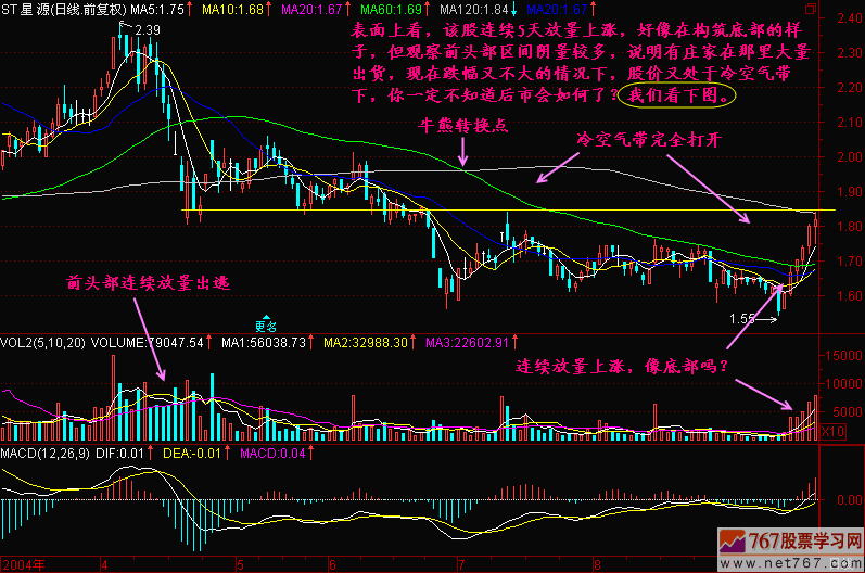 大家以后要记住了,在【冷空气带】下面,如果有小平台盘整不要乐观,这不是底部,相反很容易发生向下巨量跳空,快速下跌。这是我们炒股十几年总结出来的一个惨痛教训,是输了很多很多钱才体悟出来的。对这类走势,你要避免风险就记住一句话:【我们不做2-3】。有人说,我已经呆在里面了怎么办?【冷空气带】下面的小平台前底部被打穿时,就要引起警惕,这个地方十有八九是要暴跌的,这是最后的末班车,否则一旦跳空下来,你就很被动了。