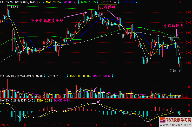 庄家在头部开始出货时,股价逐渐跌至60日平均线附近,而60日平均线是生命线,股价以收盘价切入60日平均线,是股价走软的先兆!