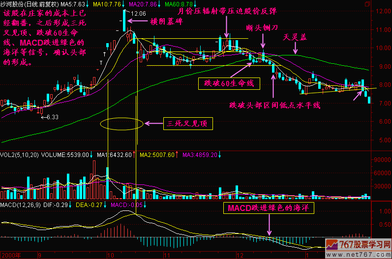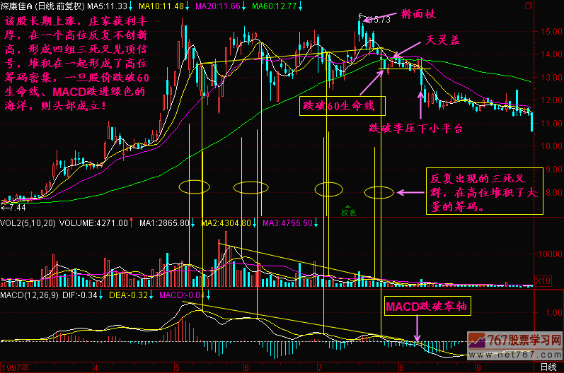 第一个是【三死叉见顶】。这是一个用得比较多、效果比较好的判断头部的方法。所谓三死叉就是股价5日均线与10日均线死亡交叉;成交量5日均量线与10日均量线死亡交叉;MACD中DIF与DEA死亡交叉。这三个单一信号都是见顶信号,每一个单一信号都可以认定头部成立,将三个单一信号复合在一起就形成了一个复合信号。在一波较大涨势后,当这三个死亡交叉陆续出现时,就基本可以认定股价正运行在头部区间。【三死叉见顶】准确率很高,可靠程度很高,几乎可以确定股价的头部。