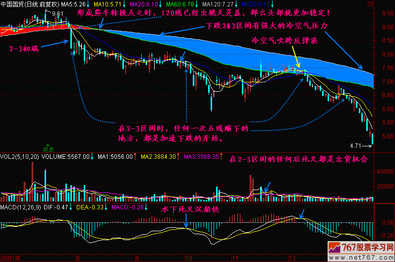 当股价经过“牛熊转换点”之后,就进入了“下跌2&3初端”、“下跌2&3中端”、“2-3中端”了。
