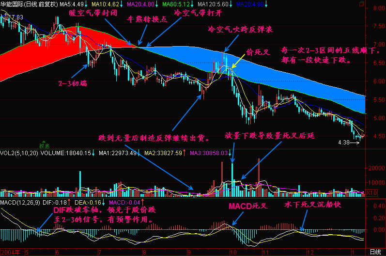 当股价处于“2-3区间”时,每一次形成五线顺下,都是一个暴跌的开始,尤其以三死叉为最,每次在2-3区间形成三死叉,都能诱发一轮暴跌,如果每一次暴跌都能创新低,那么跌势还未结束,或者说还处于“2-3中端”,一直要跌到什么时候不创新低了,那才可能是“2-3末端”,而“2-3末端”仅仅是跌势趋缓,有可能筑底的区间,至于筑底以否,还取决于是否有庄家在低位介入,如没有庄家介入,也仅仅是一个阶段性构筑的自然底部而已,并不会爆发行情。