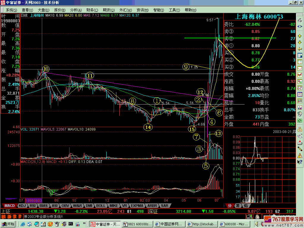 6、(11)最高收盘价形成的水平线与(10)最高收盘价形成的水平线距离很近,因此,我们只是有代表性地讲解(10)处颈线位的情况。这里是7。25元,股价如果冲过这条颈线位,其上方已经没有任何颈线位和任何均线的压力,这种情况称为“头顶一片蓝天”,上升空间很大。既然如此,(9)处应该是个买入点。然而,7。25元的买入价,比起5。54元的买入价毕竟高出了许多。在这个价位买入,心里是否有点不平衡?