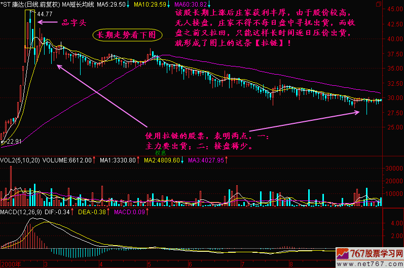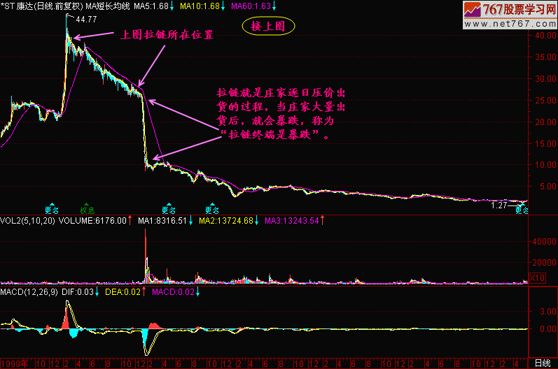 庄家天天如法炮制,于是每天的K线都带上、下影线,排列在一起,远看上去就像一条拉链。既然【拉链】是庄家出货过程中留下来的痕迹,那么【拉链】就是股价将要下跌的预兆。