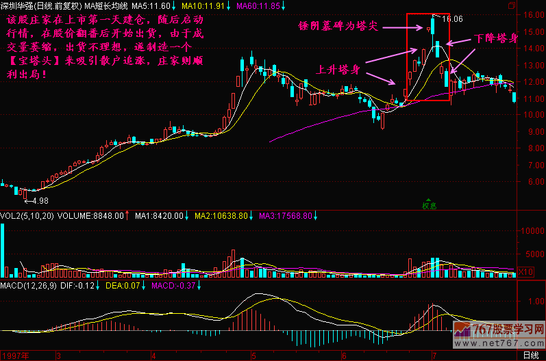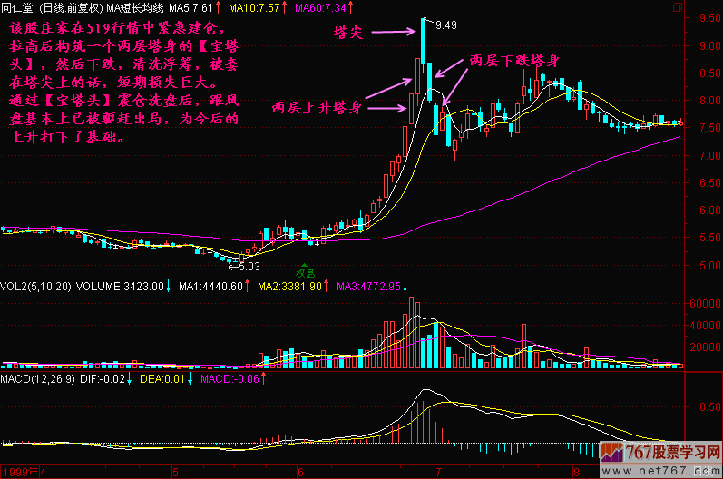 庄家针对【天门】头部的弱点,又设计了一种股价【宝塔头】。一般股价在【塔尖】上停留的时间很短,便会快速下跌,时间之短令人防不胜防,稍有犹豫就会错过在高位出货的机会,被套在了高处不胜寒的【塔尖】。
