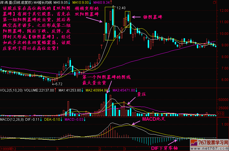 第112节:墓碑坟头如果我坐庄,看中了一个10元的股票,那么,第一阶段肯定是没法在低价位建仓,建仓的价格区间估计在10元到15元之间,建仓的时间在一个季度左右。建仓的时间越长,买进的筹码就越多,成本也就越低。假设我们建仓完毕后的成本是13元的话,那么必须要拉高到26元以上出货才能盈利。假如在指数条件的配合下,我们拉高股价,拉到26元以上开始出货,随着不断卖出,股价开始下跌,跌到26元与13元的中间,即19.5元的价位。如果,此时还没有完全清仓,那么,我就陷入了麻烦。因为继续出货,盈利会越来越小。一般情况下,我会停止卖出。并且再次逢低买进,因为这个价位比我的目标价位26元毕竟要低。随着第二次拉升,股价又会接近前面那个头部26元,在那里被套牢的人肯定希望有人去解放他们。所以,我会在25.50元处停止拉升,并且,在那儿抓紧出货。经过一段日子,终于在25.50元附近全部出完。失去庄家的股票只能节节滑落,最终回到启动前的价位。用线条表示这种走势,就能清楚地看出【墓碑坟头】的图形。见草图(图112-1)所示。图112-1图112-2用如此多的K线组成的图形,其唯一性是有保障的。也就是说,像【墓碑坟头】这样的图形,在个股走势中并不会频繁地出现,一旦出现,就必然会形成头部。问题是,等我们完全看清楚【墓碑坟头】的图形,股价已经跌回到了启动的地方。怎么样才能在【墓碑】顶部、【坟头】的头部及时出逃?我们通过研究完整的【墓碑坟头】的图形,理解它的市场意义,从而找出在顶部出逃的方法。如何在【墓碑坟头】的顶部出逃,已经有了很多方法,在今后的课程中将逐一解释。关于在【墓碑】顶部出逃,在以前的课程中已有介绍,如:【宝塔头】、【阳阴墓碑】、【阳阴墓碑夹】等章节中介绍过。这里重点介绍【坟头】出逃的方法。