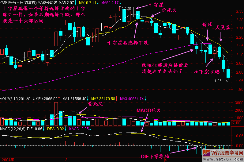 十字星确实有涨也难,跌也难的意思,但它只表明在这一天的行情中,多空力量平衡,今天股价走势失去方向,这正好说明未来将寻找突破的方向。如果未来股价选择向上突破,那么这一天的十字星处于股价的低位,或称底部。如果未来股价选择向下突破,那么这一天的十字星处于股价的高位,或称头部。