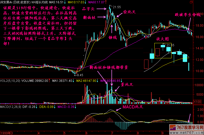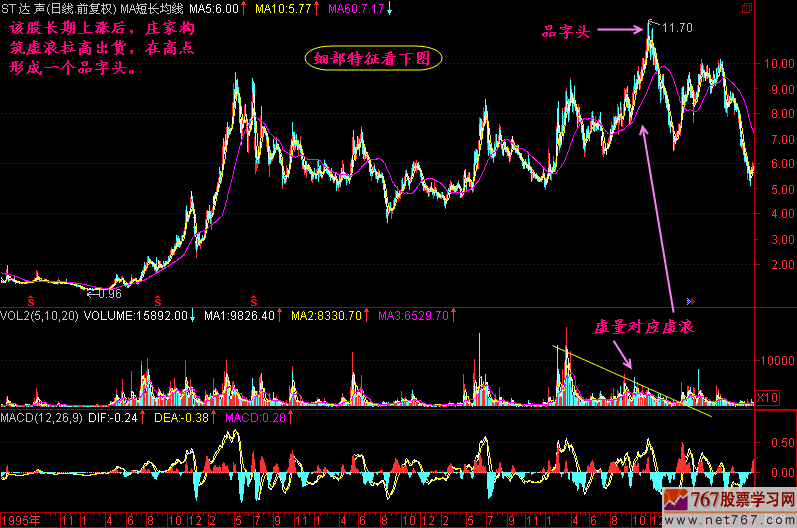 所谓头部,就是股价由上升转为下跌的拐点。分析“品”字,可以看到它的三个方框,按照阶梯式上升,然后又“阶梯式”下降来排列的。可以想象,形成一个头部,如果用三根K线来表示的话,其排列应该是“品”字形的。
