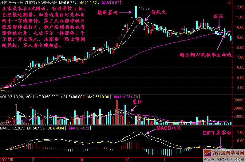 第112节:墓碑坟头如果我坐庄,看中了一个10元的股票,那么,第一阶段肯定是没法在低价位建仓,建仓的价格区间估计在10元到15元之间,建仓的时间在一个季度左右。建仓的时间越长,买进的筹码就越多,成本也就越低。假设我们建仓完毕后的成本是13元的话,那么必须要拉高到26元以上出货才能盈利。假如在指数条件的配合下,我们拉高股价,拉到26元以上开始出货,随着不断卖出,股价开始下跌,跌到26元与13元的中间,即19.5元的价位。如果,此时还没有完全清仓,那么,我就陷入了麻烦。因为继续出货,盈利会越来越小。一般情况下,我会停止卖出。并且再次逢低买进,因为这个价位比我的目标价位26元毕竟要低。随着第二次拉升,股价又会接近前面那个头部26元,在那里被套牢的人肯定希望有人去解放他们。所以,我会在25.50元处停止拉升,并且,在那儿抓紧出货。经过一段日子,终于在25.50元附近全部出完。失去庄家的股票只能节节滑落,最终回到启动前的价位。用线条表示这种走势,就能清楚地看出【墓碑坟头】的图形。见草图(图112-1)所示。图112-1图112-2用如此多的K线组成的图形,其唯一性是有保障的。也就是说,像【墓碑坟头】这样的图形,在个股走势中并不会频繁地出现,一旦出现,就必然会形成头部。问题是,等我们完全看清楚【墓碑坟头】的图形,股价已经跌回到了启动的地方。怎么样才能在【墓碑】顶部、【坟头】的头部及时出逃?我们通过研究完整的【墓碑坟头】的图形,理解它的市场意义,从而找出在顶部出逃的方法。如何在【墓碑坟头】的顶部出逃,已经有了很多方法,在今后的课程中将逐一解释。关于在【墓碑】顶部出逃,在以前的课程中已有介绍,如:【宝塔头】、【阳阴墓碑】、【阳阴墓碑夹】等章节中介绍过。这里重点介绍【坟头】出逃的方法。