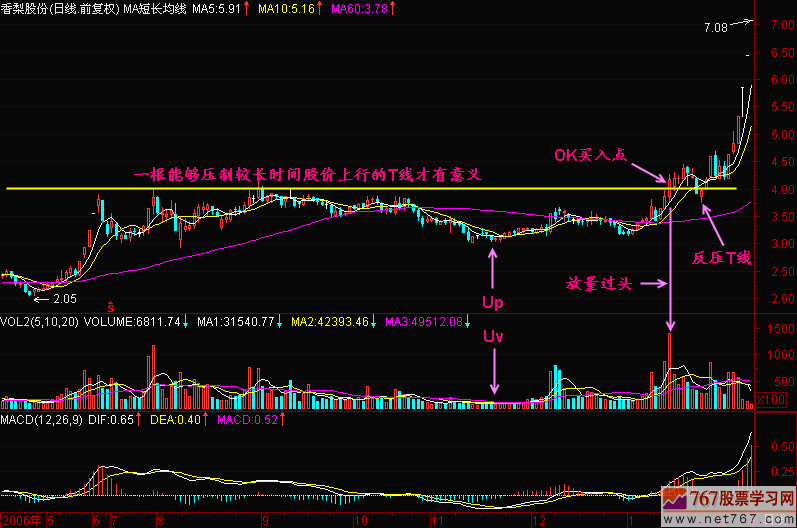(4)股价向上突破T线后,可以在回档的低点买入。因为此时已经错过了【OK买入点】的好机会,但又不想在过高的价位切入,那么只能等待在股价回落的过程中买入。有时候股价上升过快会发生回档,这是因为早期在底部买入的散户在大涨后有利可图而获利兑现。有时候股价在冲过T线后根本不存在回档,在这种情况下就不能等待回档了。那么如何判断回档与否呢?这可以根据指数条件,流通盘大小,以及当时炒作的概念进行判断。一般情况下指数条件较好,流通盘较小,并符合当时的炒作概念,在股价冲高后不容易回档。反之则容易回档。