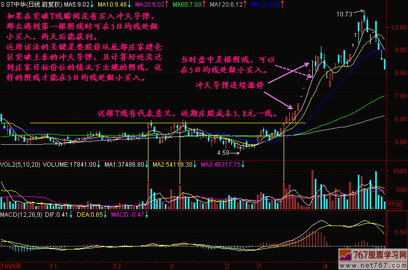 冲天导弹是指股价脱离成本区后即快速拉升的走势,这样的操盘手是猛张飞型,快速拉高、连续涨停,使人不敢贸然追高,到你敢于追进时都是高位了,对于这样的股票我们除了在启动突破T线的一瞬间及时介入以外,没有更好的办法监控,但对于这样的股票有一个小窍门,那就是冲天导弹第一次收阴线靠近5日均线时的那个位置抢进,一般几天后都能获利出局。