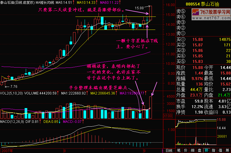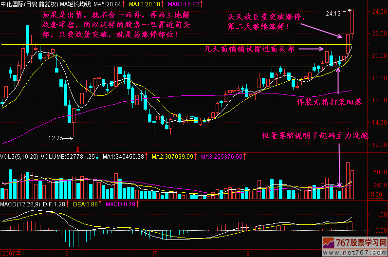 当一只股票的庄家完成建仓后,为了突破建仓区的头部T线展开行情,必然要首先靠近前头部,此时股价佯装无精打采的样子,每天成交并不一定活跃,直到股价接近顶紧右上角时,前头部已近在咫尺了,这时能感觉到一种无声的寂静,但这种寂静正是于无声处听惊雷的时候,此时的庄家就像一头已经最接近猎物的猎豹猛地跃起出击,股价放量突破T线,这个区间就是【易涨停部位】!