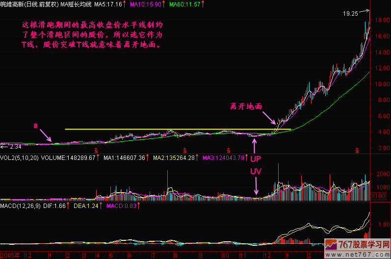 第68节:股价上穿60日均线股价在长期下跌后,出现止跌回升。股价放量上穿60日平均线的日子,称为【进入起飞线】,简称a点。在这里我们把60日平均线想象为机