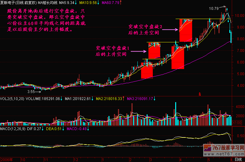【空中盘旋】是股价在离开地面以后的一次洗盘行为,在股价经过【空中盘旋】后的上扬空间,大约等于【空中盘旋】这个盘整带的中心价位至60日均价线之间的距离,否则,新一段的涨势如何展开呢?