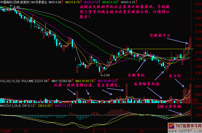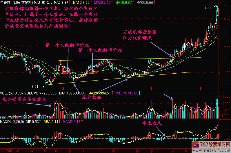 操作方法:判断好指数确实下跌空间不大的情况下,专门寻找那些失败的季托,要求第一波构筑季托时的成交量要稍有放大,只有放量才能证明有庄家收集,在跌破季托后最好能底部抬高,并且量萎缩,在判断好是失败的季托后按下面的方法操作。